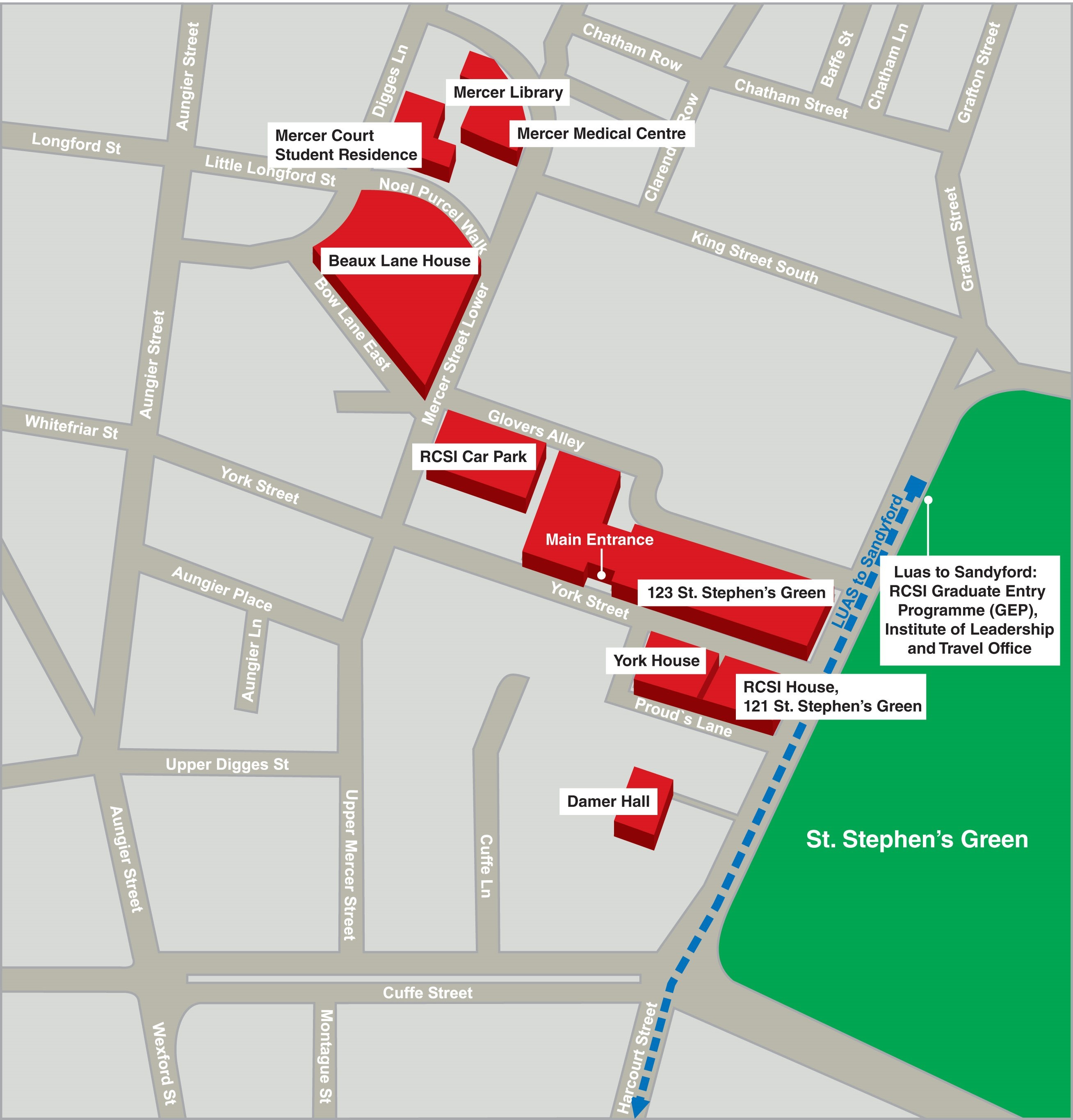 Please enter the RCSI by the main entrance on York St., (called 123 St. Stephen's Green, as the front overlooks the Green).